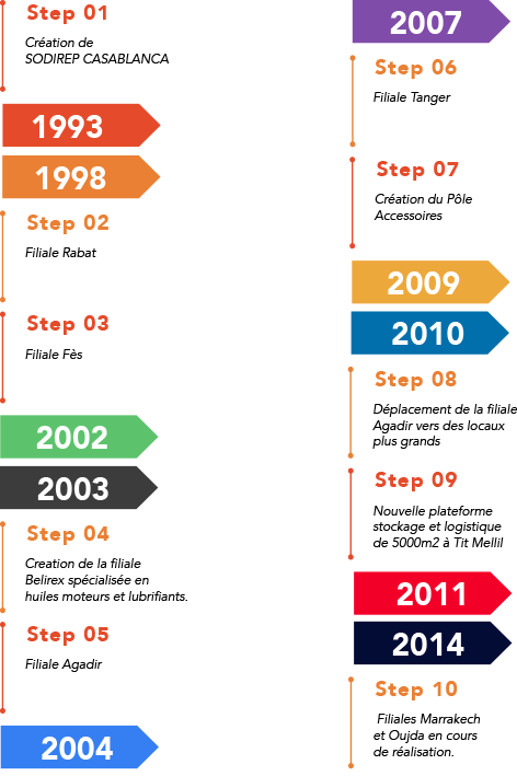 Créée en 1993, il n’a fallu a SODIREP que très peu de temps pour s’imposer comme un des leaders du marché des pièces détachées automobile au Maroc. Grâce au sérieux et au dynamisme de ses équipes, SODIREP a su se démarquer dès ses débuts grâce à sa stratégie d’expansion, ce qui lui a valu aujourd’hui de posséder pas moins de six points de ventes, en plus des deux autres en cours de réalisation.